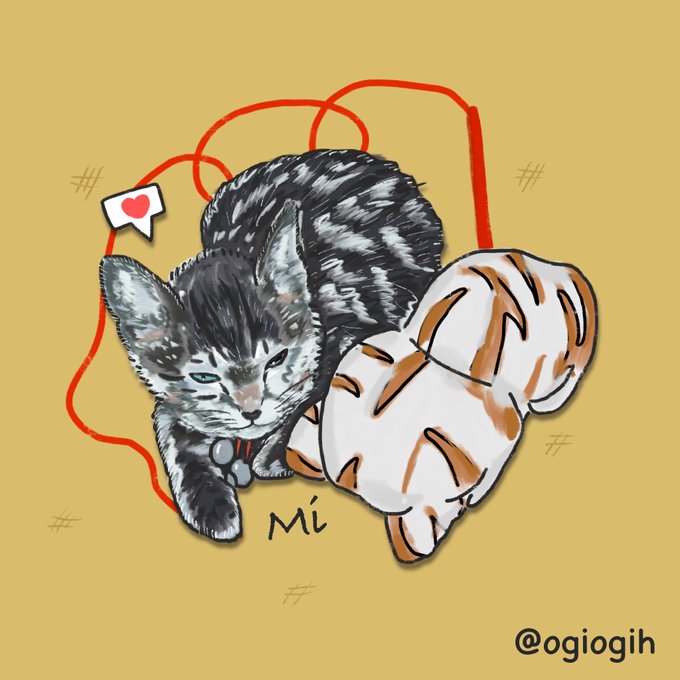 昨日 @irene_studylang さんのkuniくんとmiちゃんを描かせていただきました!miちゃんの隣にいるのは大好きだったぬいぐるみです。そして赤のおもちゃはしっかり手で押さえてあります🐈