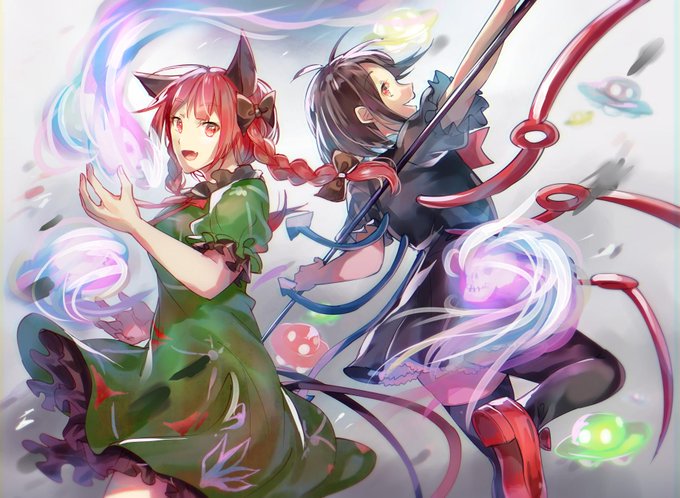 首絞めたおかげで早めに描き上げられました!ヽ(´▽`)/へへっ #お燐 #封獣ぬえ