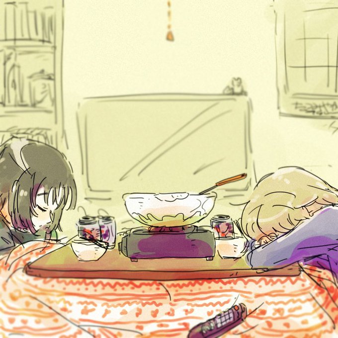 お鍋食べてあったかくなり寝落ちしてる絵