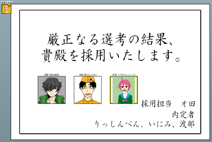 『厳正なる選考の結果、貴殿を採用いたします。』で初KPしてきました。楽しんでもらえたようでよかったです。アイコンはNPC。