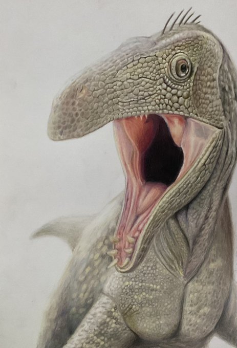 #みんなでつくるTwitter古生物図鑑 #色鉛筆画 Erlikosaurus andrewsi バヤンシレ層から見つかった、派生的なテリジノサウルス類。テリジノサウルスの仲間では、最も完全な頭骨が発見されている。
