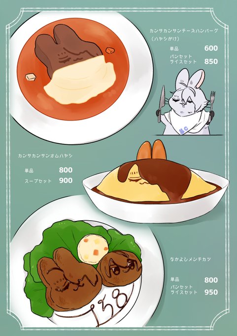 8/22 夏インテで発行予定の新刊サンプルです うさぎのカンサカンサンの喫茶店メニューのようなイラスト本 食べ物をギュギュっとまとめました!長義がうさぎなのでご注意ください