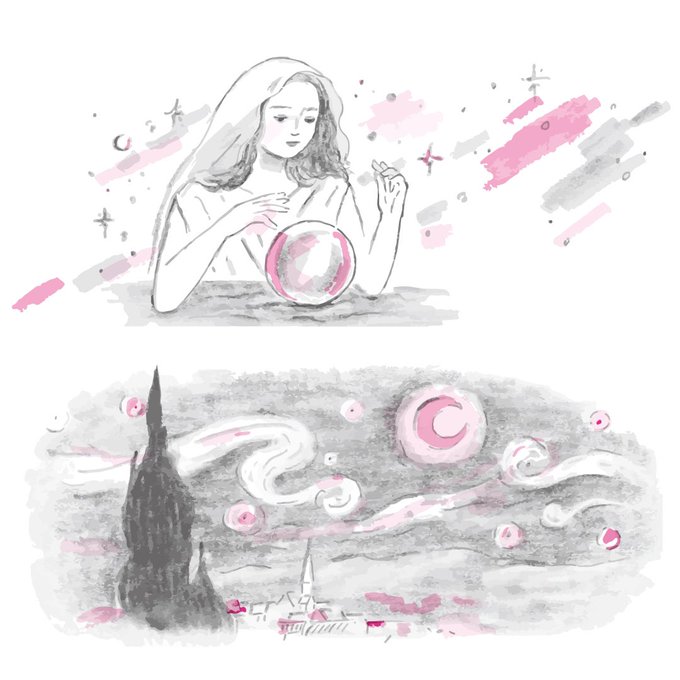 4点の中から水晶を凝視する人とゴッホの「星月夜」のオマージュ。