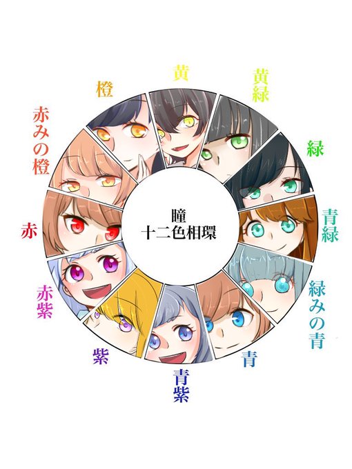 #瞳十二色相環 お借りしました(^O^)橙はどっちも黄色っぽいそして瞳の色率の偏りを感じた(寒色がクソ多かった)