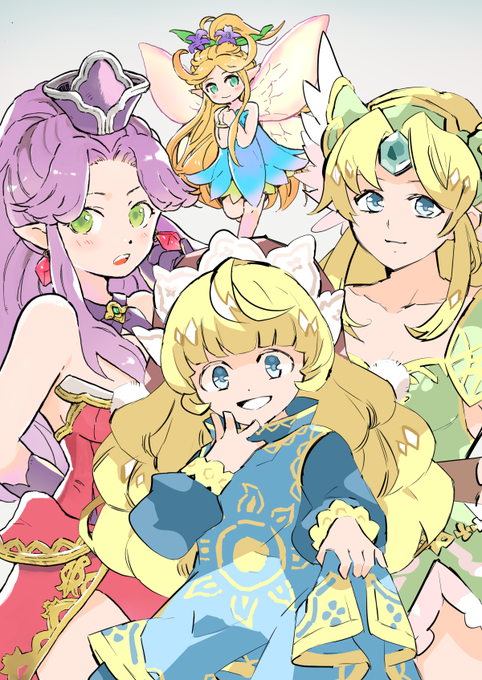 合作絵の時間だよ('ω')リースとシャルロットは自分で。アンジェラと妖精は@tamiko6794さんに描いてもらいました。アンジェラめちゃくちゃかわいいな!(クソデカボイス) #聖剣伝説3