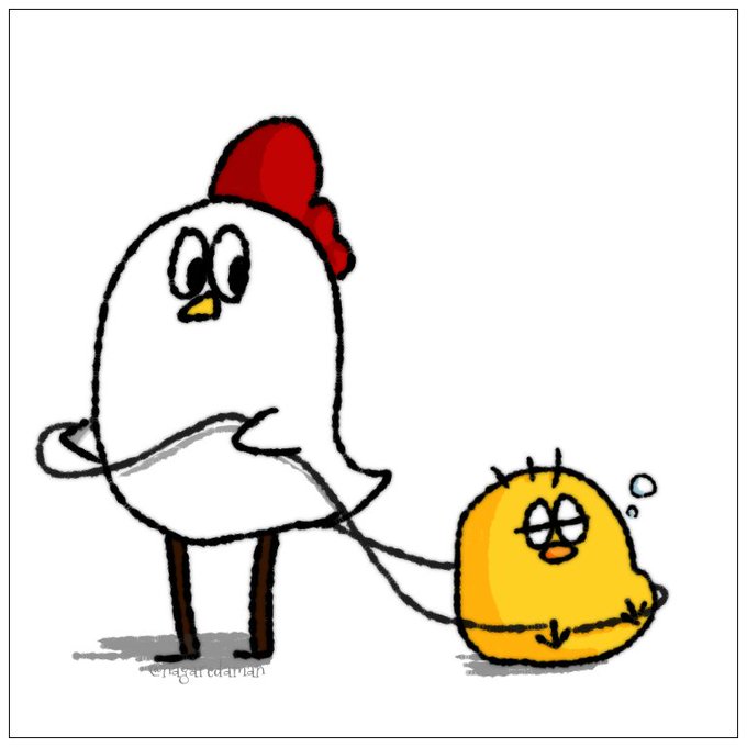 オジチキンというニワトリと、ヒヨコのイラストを描いています🐔🐣