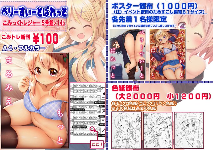 1/20こみトレのお品書きです! 新刊はA4フルカラーイラストです! べりーすいーとぱれっと『ノ14b』にてお待ちしてます!