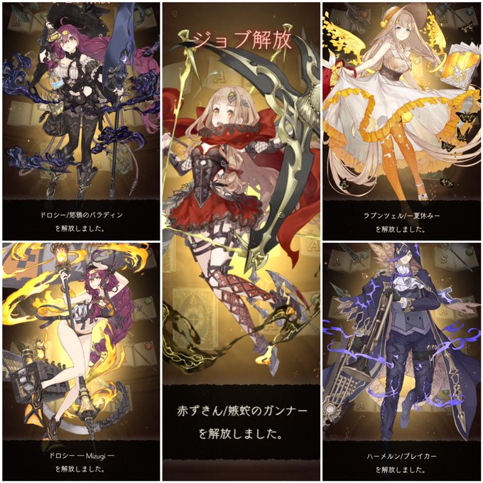 人気投票応援ガチャ、未所持ジョブだけのを1回ずつ!ずきんちゃん風弓が2本!ありがたい。かぐやポーチャーズは撮りそこねました!ドロシーはふたりもきてくれた…。ラプンツェルで夏休みコンプ。ハーメルンは防御の上がりそうなブレイカーできてくれてうれしい。(*゚▽゚*)
