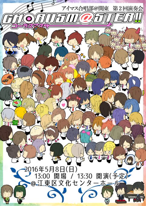 5/8(日)13時半開演、アイマス合唱部第2回演奏会に出演します!765曲をはじめとして様々な曲を合唱でお届けします。普段とは違ったアイマス曲を味わってみませんか?ぜひお気軽にお越しください!(入場無料です!)