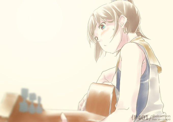 特別に音楽がめちゃ好きというわけでもないけど、新しいものに興味津々なので提督にギターちょっと教えてもらってる #伊401 。 #艦これ #艦隊これくしょん #艦これ版深夜の真剣お絵描き60分一本勝負