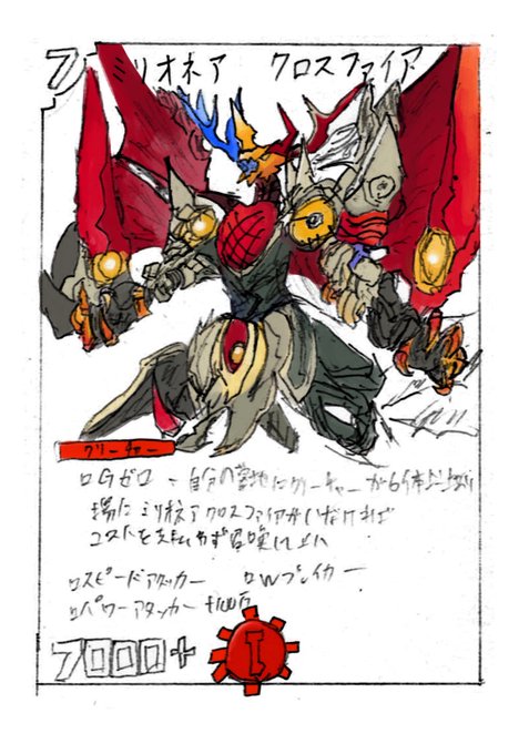 京都からの思わぬ来客の描いた、ミリオネアクロスファイア(デュエマのカード)量産して遊んでる。