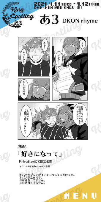 4/11-12 #DKオン2 【ほのお:あ3】 お品書き遅くなり申し訳ないです! 明日からのオンイベにて無配漫画(健全)ご用意しております 通販等はございませんので、 お買い物後ごゆっくりお越し頂ければと思います。😌 #DKオンサークル #DKオン無配