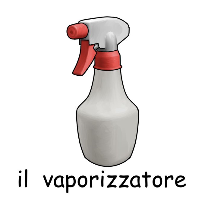 霧吹き【vaporizzatore】(ヴァポリッザトーレ) vaporeには水蒸気、湯気などの意味があり、vaporizzatore(蒸気をだすもの)と言って、霧吹きを表します。 また、vaporizzatoreには加湿器という意味もあります。 #イラスト #イタリア語