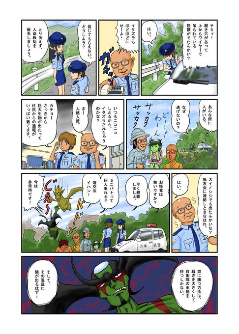 怪獣レスリングと言ったら、市街地でしょ。建物大破壊とかやりたいじゃないですか。描きたいじゃなくてやりたい。描くの大変だけど、やりたいが勝と描けるんです・・・どーかなー