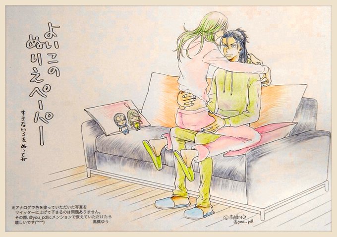 高橋ゆうさん @you_pdl の全ケイ無配、よいこのぬりえさせて頂きました🙇色鉛筆塗りなので淡淡(あわあわ)ですが…。セイカの王子様&お姫様ぬりえを思い出した💜💚あざました!