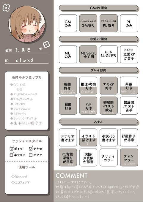 #TRPG好きと繋がりたい #TRPG自己紹介シート 自陣とうちよそによく狂います💪 ♡かRTで気になった方お迎えさせていただきます!よろしくお願いいたします~🌟