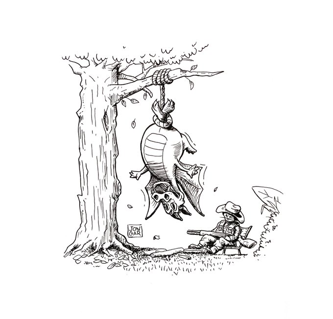 #illustration #sketch #sketchbook #drawing #handdrawn #inktober #marchofdragons2023 #comic #cartoon #dragon #forest #ambush #hunt #hunter #tree #dragon #gun #jungle