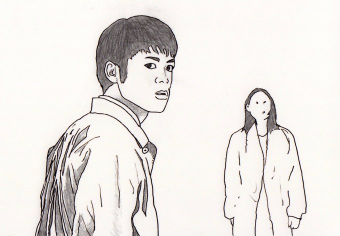 高橋洋監督の短編映画「宇宙の裏返し」から、俳優の釜口恵太さんを描きました。(奥は河野知美さん)