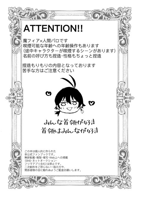 1月29日の東4ホール ソ06a にて頒布予定の新刊です! 魔フィ×人間パロ💥🔫首領愛され本となっております…! 喫煙シーンもあるので、年齢操作?もあります…(喫煙OKの年齢というご都合操作) 捏造もりもりですが、どうぞよろしくお願いします😂🙌 1/2