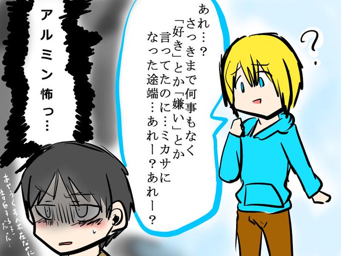 エレミカで、エレンさん→ミカサへの「好き」を言わせようとするアルミン。アルミンのキャラ崩壊注意です…!! そして雑…!!!(´・_・`)