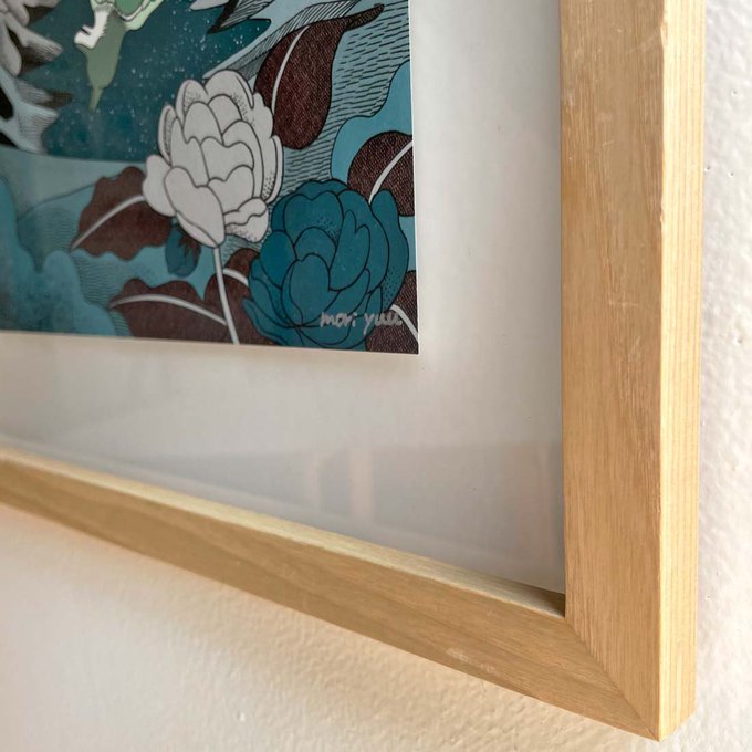 ジークレープリント作品。空に浮かぶ大きなたい焼きが印象的な作品。水鏡が映し出す狼やコラージュされたような表現から、非現実的な雰囲気を感じます。