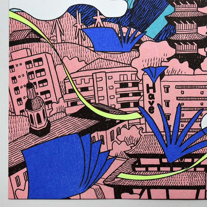 リソグラフ印刷ならではの鮮やかな発色と、カスレやムラなどの独特の風合いが魅力的。想像力溢れる、森さんならではの浮遊感ある絵柄が素敵です。