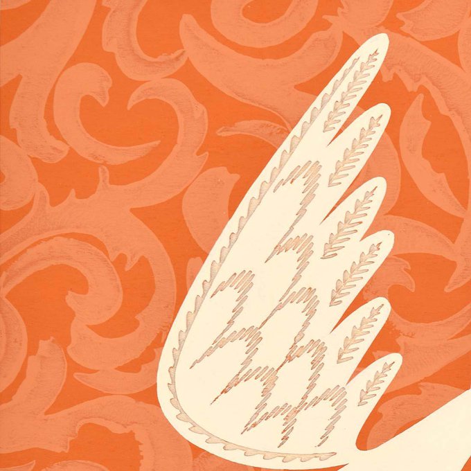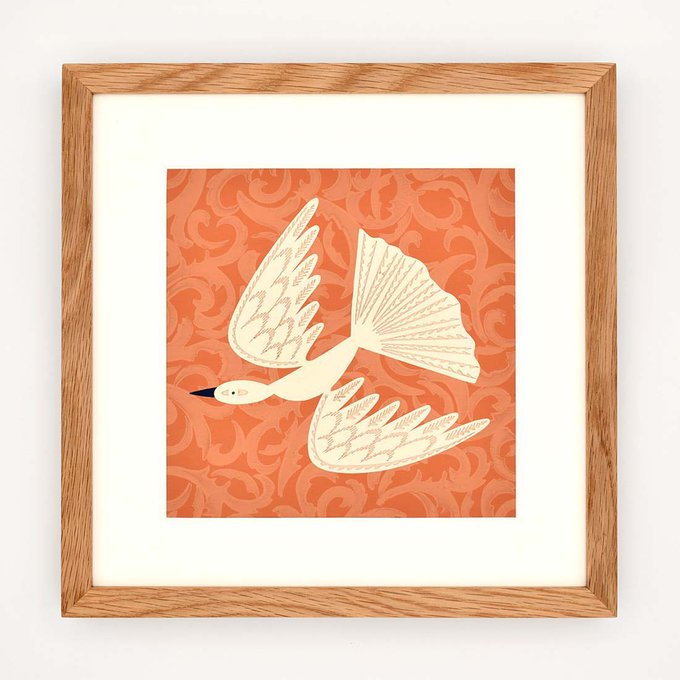 心地よく空を飛ぶ一羽の白い鳥。繊細な彫りで表現された羽の模様が美しいです。彫ることによって現れた絵具の重なりが、作品に深みを増しています。