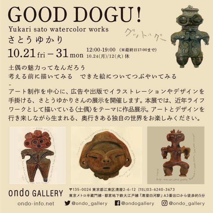 さとうゆかりさんの展示開催。近年ライフワークとして描いている〈土偶〉をテーマに作品展示。アートとデザインを行き来し生まれる、奥行きある世界をご覧下さい。