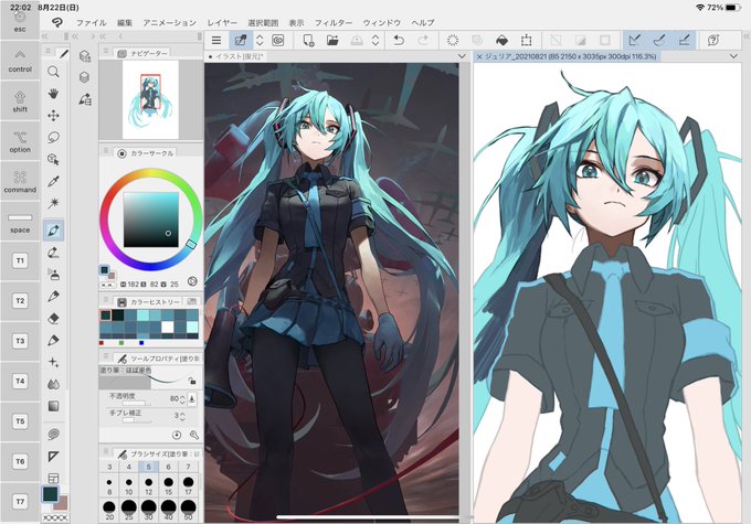 メチャクチャムズい。色数すげー多いし、影色が想像よりだいぶ鈍い。どんな基準で色選んでるんだろ?主線は最後に上から描いてるのか?ブラシはなんかシンプルな丸筆っぽい?メイキング動画見てみたいなぁ。