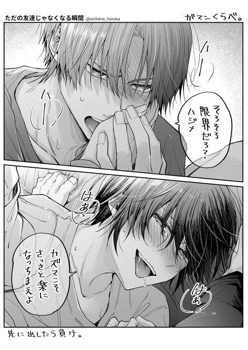 ガマンくらべ(SNS版) #創作BL 友瞬3巻の【とらのあな限定 公式同人誌特典】はコレを元にしたお話で勝負の一部始終を「全部」描いたスケベな薄い本です(話も結果も新規&アレの修正が単行本より緩い) 通販予約受付中⇒https://t.co/WpBzPI4Kbk https://t.co/BbgmZJklvz