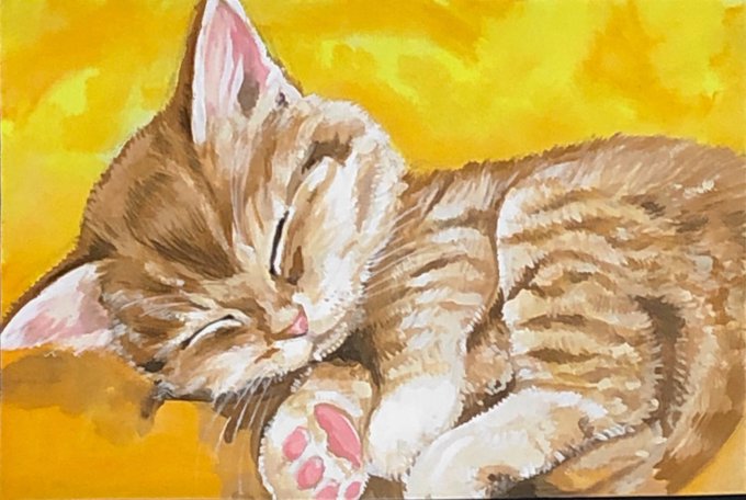 おやすみニャンコ❤️❤️ アクリル絵の具 B5ケント紙 ちっちゃな寝ているニャンコさん描きました❤️❤️ かわいいニャ〜❤️❤️ #鬼辰一日一絵