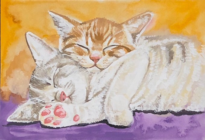 おやすみニャンコ❤️🥰 アクリル絵の具 B5ケント紙 バンザイしておやすみしているニャンコさん描きました❤️❤️ #鬼辰一日一絵