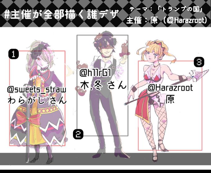 #主催が全部描く誰デザ 原さん(@Harazroot )の企画に参加させていただきました。 テーマは「トランプの国」 投票をツリーしますので僕のキャラを当ててみてね。 設定などのヒントは明日1/11に(ツリーします) 答えは明後日1/12に出します! では、よろしくお願いします🙇
