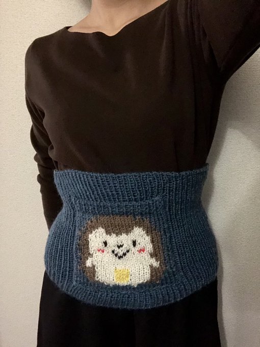 おおはら母の手作り腹巻き。 つくね柄のカイロポケットもつけてくれました(笑) カイロポケットのつくねもカイロ貼ってます(たぶんこのイラストみたいな感じ 笑) これでこの冬は快適にビールを飲めます!\( ˆoˆ )/ #はりねずみのつくね