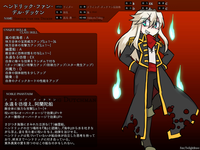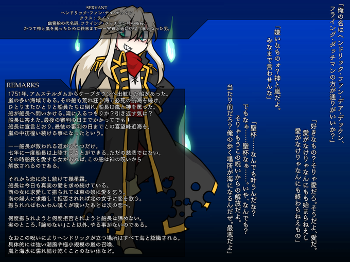 @FTB_TL 【@Fate_T_B 】様に七人目、恋に恋するライダー船長、フライング・ダッチマンことヘンドリック・ファン・デル・デッケンです。リプで追記などしていく予定です。