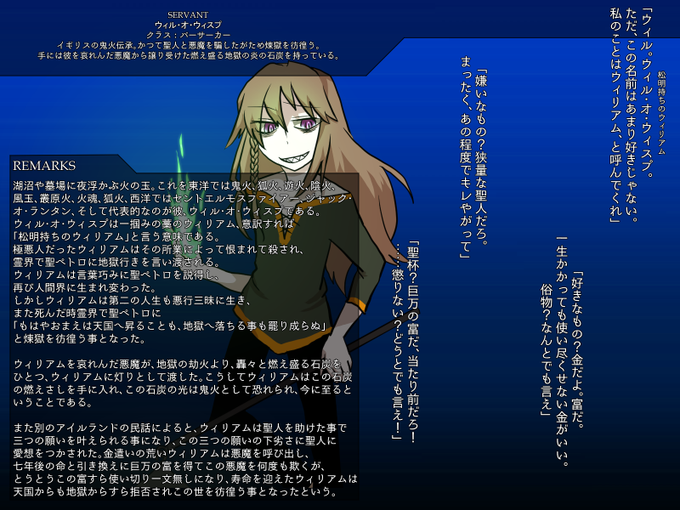 @FTB_TL 【@Fate_T_B 】様に八人目、お金大好きな悪人、ハロウィンのバーサーカー、ウィル・オ・ウィスプです。リプで追記などしていく予定です。