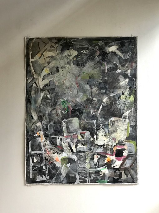 いよいよ2週間後に始まる山本亜由夢『我々の休暇』、搬入第一弾。メインの100号作品を設置して全体の構成を検証。部屋に満ちてくるオイルペイントの匂いが何だか懐かしい。