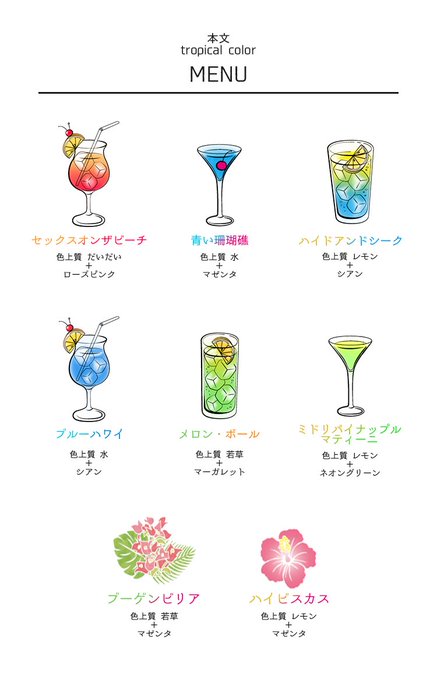 『表紙2.3印刷』にはFCの南国風テンプレート、『遊び紙』はビビッドで透け感のある用紙、『本文』にはトロピカルカクテルなどをイメージしたカラーをご利用いただけます🍸