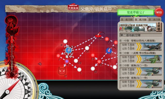 道中は潜水→空襲→潜水空襲→夜戦→ボスとなっていますが潜水空襲マスに画像通りに基地送ると潜水艦をほぼ処理できつつ後方ヌ級を棒立ちにできます。