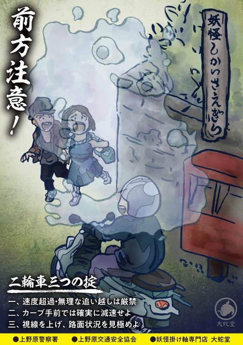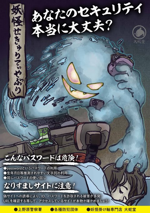 「セキュリティ犯罪」「振り込め詐欺」「二輪車事故」「飲酒運転」を妖怪にみたて、大蛇堂オリジナルで描いています。