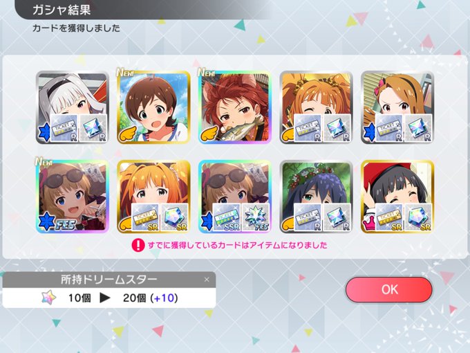 ミリシタ 今日から突如無料10連ガシャが来ましたね‼️ しかもフェス中でSSRの排出率が2倍という‼️ これは始めて間もない自分にとっては良いチャンス‼️👍 まずは無料10連からで‥‥っていきなりSSR⁉️ で、何故かチケットなる物があるみたいでそれも使ってみました。 すると⁉️ かなり当たりですよね😝