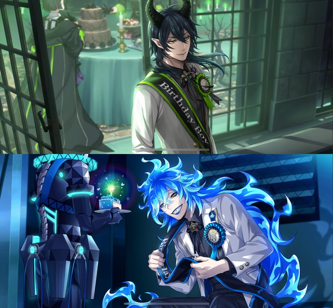 ケーキ&蝋燭を背後に微笑む🐉とケーキ&蝋燭を目の前に微笑む💀 あと角度対比はないけど笑顔の🐉とキレ顔💀もよろしく