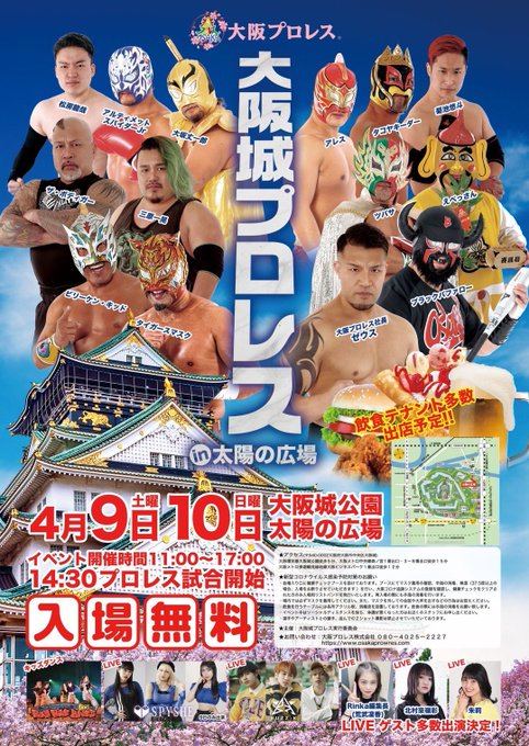 【拡散】 明日もやりまーす😁 入場無料❣️ 11:00からやってまーす❣️ 🌸🏯『大阪城プロレス』🏯🌸 ※大阪城公園 太陽の広場 ⭐️#大阪プロレス あり🤼♀️ ⭐️ライブステージ あり🎶 ⭐️グルメ屋台 あり🍔🍜🍡🍻 🌸春の城公園で2日間🌸 ※4月10日 両日11:00〜17:00