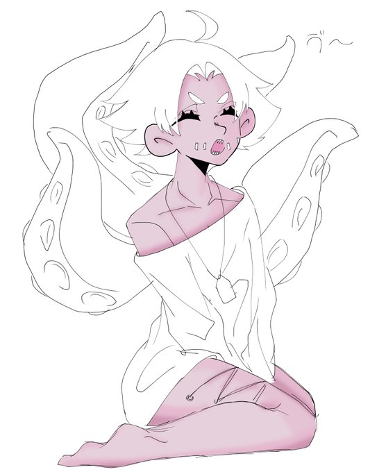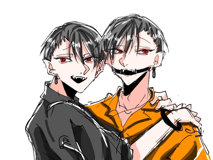 #君おじゃ_キャラ練り このタグ初めて知った、、、ヴッ、、 左側に髪を上げてるオレンジ色の口枷男がうちの子、吸血鬼で出そうとしてます、、