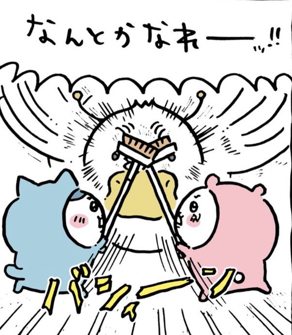 @ngnchiikawa オノマトペなうさぎと、言いたいことを瞬時に理解するハチワレさん凄すぎる