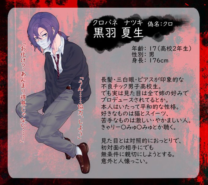 【黒羽 夏生】の事前関係ゆったり募集します~ ふぁぼお迎えに上がります。記載している以外にも、色んな関係性幅広く募集してますのでこんなのを!というのがあればお気軽にお声掛けくださいませ~!皆と仲良くしたい!