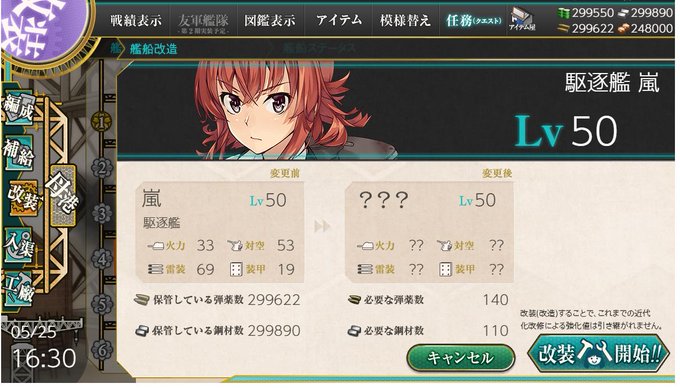サミュちゃんもインピッピ同様演習メインだったのでこの際に改造。2スロから3スロへ。あとサミュちゃんは改造することで先制雷撃が付加されるのね。