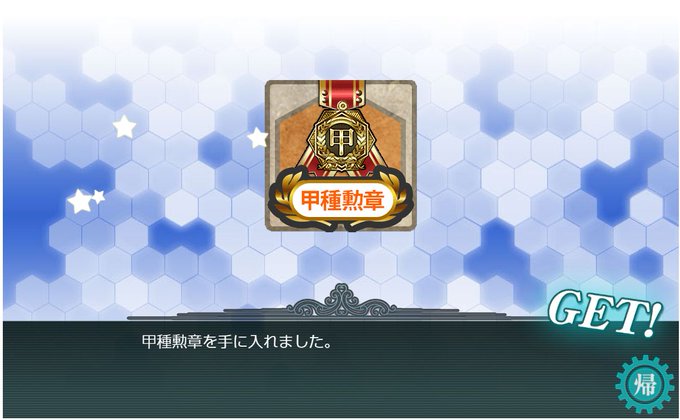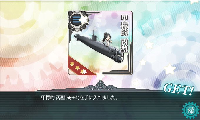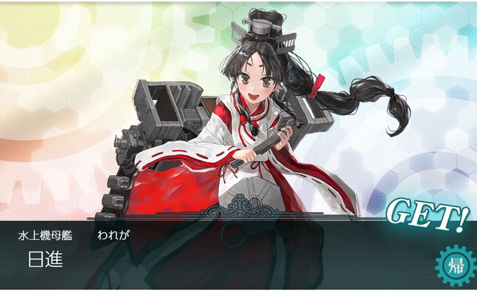 報酬は勲章2個、改修資材10、甲標的丙型★42個、甲種勲章、そして日進ちゃん。甲標的2個っつうのは次回イベントのなにかの前触れだろうか・・・