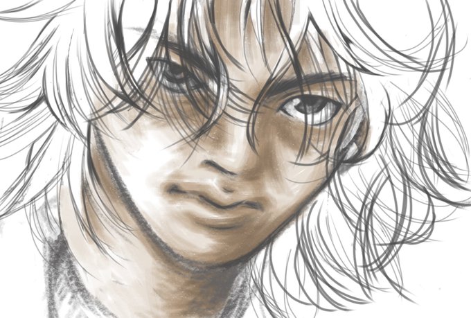ちょっとイラスト寄りにし過ぎたかな😅 削ぎ落とし過ぎて鼻と口周りがしっくり来ないから直すかー イラストとリアルの中間点、難しい💦 #雑描き