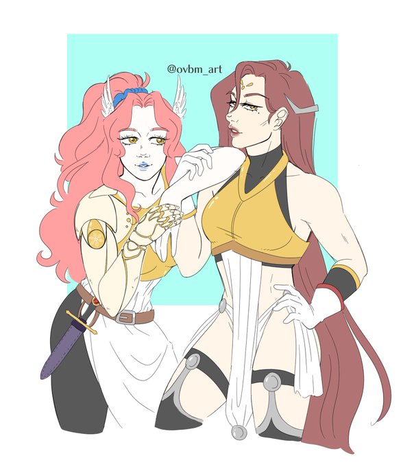 Drew some more summoner oc’s!! This time it’s the two valkyries Sylph (belonging to @SylphEmblem) and Cait (belonging to @grimastiddies ) 💖💖💖